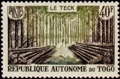 40f., brun-violet, olive et vert foncé Y&T N°274 emitida el 1957 Casques Konkomba, Cobe de Buffon ou le Teck |