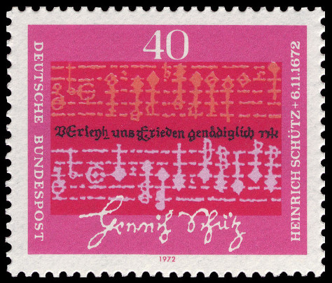 40p., rose, rouge-orange et noir Y&T N°591 Michel N°741 Emis en 1972 Dentelé 14x13½ 300e anniversaire de la mort du compositeur Heinrich Schütz |