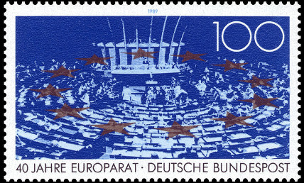 100p., bleu, or et noir Y&T N°1254 Michel N°1422 Emis en 1989 Dentelé 14 40e anniversaire du Conseil de l'Europe |