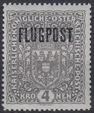 4k., gris Y&T N°PA3 Michel N°225 Emis en 1918 Timbre avec surcharge noire "FLUGPOST" Gravé Dentelé 12½ |