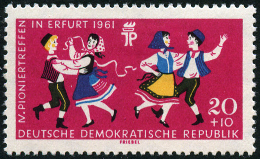20p. + 10p., polychrome Y&T N°544 Michel N°828 Emis en 1961 Dentelé 13x12½ Filigrane "DDR" 4e rassemblement des jeunes pionniers, à Erfurt |