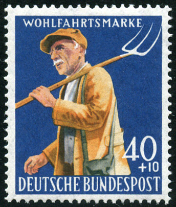 40p. + 10p., bleu foncé, jaune et gris Y&T N°171 Michel N°300 Emis en 1958 Dentelé 14 Filigrane "DBP" Légende "WOHLFAHRTSMARKE" Au service de l'humanité |