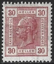 30h., lie-de-vin Y&T N°100 Michel N°138 Emis en 1906 Valeur en Heller Papier avec fils de soie Chiffres inscrits en couleurs Dentelé 13x12½ |