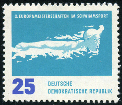 25p., turquoise et outremer Y&T N°623 Michel N°910 Herausgegeben von 1962 Dentelé 14 Filigrane "DDR" 10e championnats d'Europe de natation, à Leipzig |