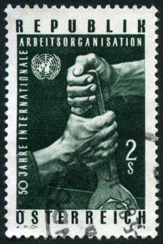 2s., vert-noir Y&T N°1135 Michel N°1305 Herausgegeben von 1969 50e anniversaire de l'Organisation Internationale du Travail (O.I.T) Dentelé 13x13½ |