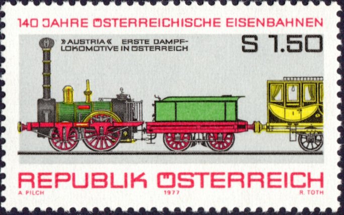1.50s., rouge, noir, vert et jaune Y&T N°1389 Michel N°1559 Emis en 1977 140e anniversaire des chemins de fer autrichiens Dentelé 14x13½ |