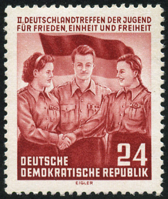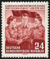 24p., brun carminé Y&T N°167 Michel N°429 Emis en 1954 Dentelé 13½ Filigrane "DDR avec cor" 2e congrès mondial de la Jeunesse pour la paix, l'unité et la liberté |