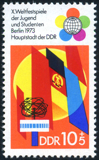 10p. + 5p., polychrome Y&T N°1527 Michel N°1829 Emis en 1973 Dentelé 12½x13 10e festival mondial de la jeunesse et des étudiants, à Berlin Surtaxe au profit de la fédération de la jeunesse de la R.D.A |