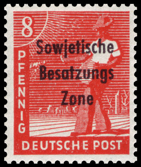 8p., rouge Y&T N°10 Michel N°184 Emis en 1948 Dentelé 14 Filigrane "POST DEUTSCH" Surcharge "Sowjetische Besatzungs Zone" |