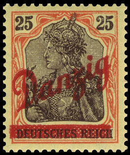 25p., rouge et noir sur jaune Y&T N°29 Michel N°24 Herausgegeben von 1920 Avec surcharge carmin Danzig en diagonale |