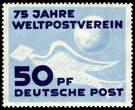 50p., bleu et bleu-noir Y&T N°59 Michel N°242 Herausgegeben von 1949 Dentelé 13½ Filigrane "fil de fer" 75e anniversaire de l'U.P.U |