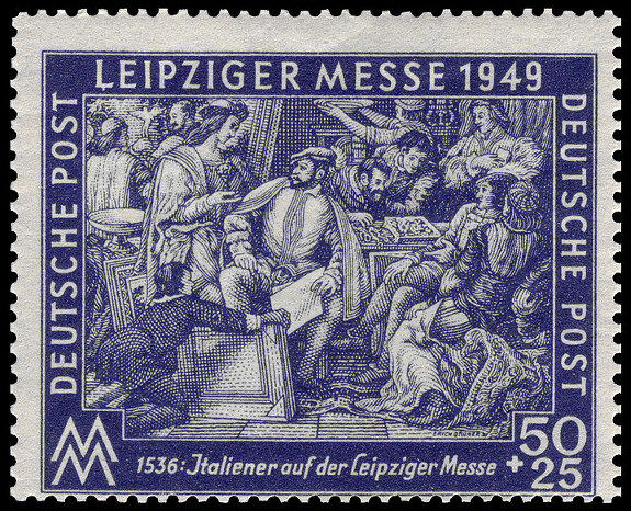 50p. + 25p., bleu Y&T N°50 Michel N°231 Herausgegeben von 1949 Dentelé 13½ Filigrane "fil de fer" Foire de printemps de Leipzig |