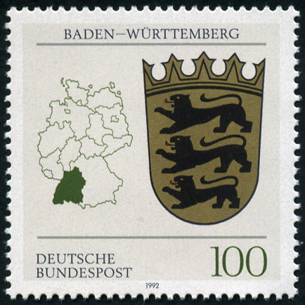 100p., gris, or, noir et olive Y&T N°1418 Michel N°1586 Herausgegeben von 1992 Dentelé 14 Armoiries des Länder d'Allemagne fédérale |
