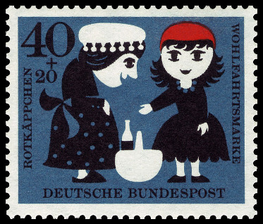 40p. + 20p., bleu, noir et rouge Y&T N°216 Michel N°343 Emis en 1960 Dentelé 14 Filigrane "DBP" Scènes du "Petit Chaperon rouge", des frères Grimm Au service de l''humanité |