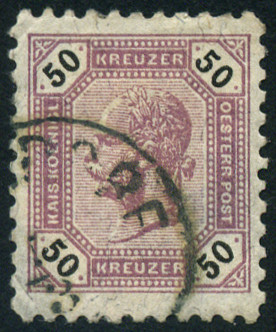 50k., lilas Y&T N°64 Michel N°66A Emis en 1891 Valeur en Kreuzer Papier avec fils de soie Chiffres inscrit en noirs Dentelé 10 à 13½ |