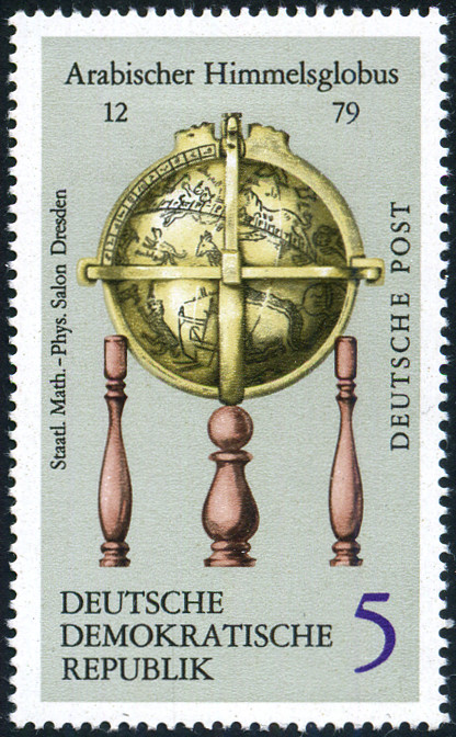 5p., noir, violet, rose et jaune Y&T N°1478 Michel N°1792 Emis en 1972 Dentelé 14 Globes terrestres et célestes du Salon national des physiques mathématiques de Dresde |