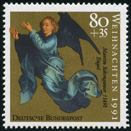 80p. + 35p., polychrome et or Y&T N°1412 Michel N°1580 Herausgegeben von 1991 Dentelé 14 Détails d'oeuvres du peintre et graveur Martin Schongauer Noël |