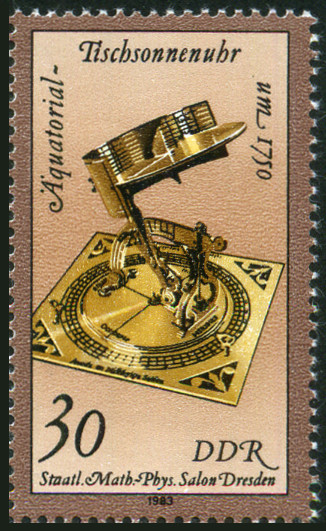 30p., polychrome Y&T N°2442 Michel N°2799 Emis en 1983 Dentelé 14 Pièces du Salon nationale de mathémathiques-physiques de Dresde Sabliers et cadrans solaires précieux |