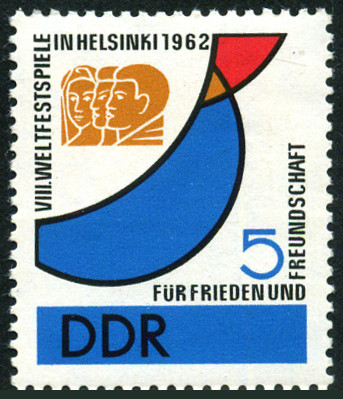 5p., noir, bleu, brun-jaune et rouge Y&T N°615 Michel N°902 Herausgegeben von 1962 Dentelé 14 Filigrane "DDR" 8e festival mondial de la jeunesse et des étudiants, à Helsinki Les timbres n° 614, 615, 618 et 619 se tiennent en carré |
