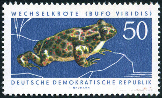50p., bleu, olive et rose Y&T N°684 Michel N°981 Herausgegeben von 1963 Dentelé 14½ Filigrane "DDR" Protection de la faune |