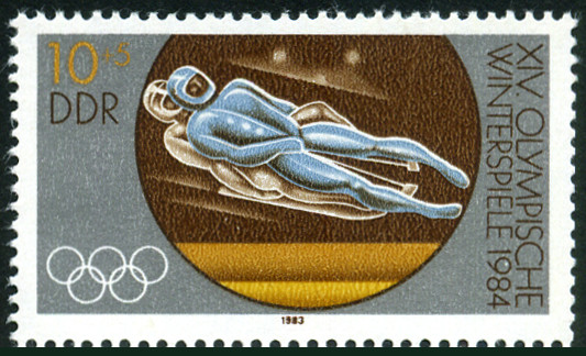 10p. + 5p., polychrome Y&T N°2478 Michel N°2839 Emis en 1983 Dentelé 14 Surtaxe pour la "Société de promotion aux endurances olympiques en R.D.A" Jeux olympiques d'hiver, à Sarajevo (1984) |