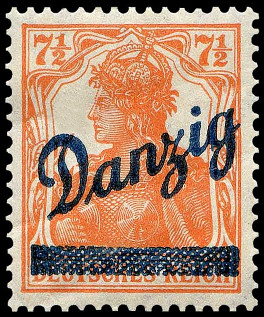 7½p., orange Y&T N°25 Michel N°35 Herausgegeben von 1920 Avec surcharge bleue Danzig en diagonale |