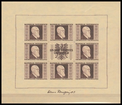 8*5s.+5s., brun Y&T N°BF5 Michel N°775B Emis en 1946 Timbre n° 637 sur feuillet avec armoiries d'Autriche Non dentelé |
