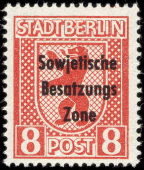 8p., orange Y&T N°26 Michel N°202 Herausgegeben von 1948 Dentelé 14 Légende STADT BERLIN Surcharge "Sowjetische Besatzungs Zone" |