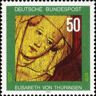 50p., polychrome Y&T N°947 Michel N°1114 Emis en 1981 Dentelé 14 750e anniversaire de la mort de Sainte Elisabeth de Thuringe Détail d'un tableau de 1420 |
