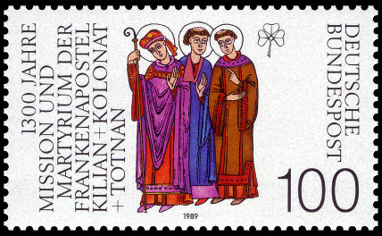100p., polychrome Y&T N°1256 Michel N°1424 Emis en 1989 Dentelé 14 1300e anniversaire de la mission et du martyre des 3 apôtres en Franconie Emission conjointe R.F.A - Irlande |