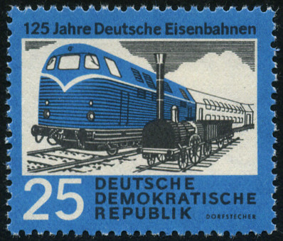 25p., bleu et noir Y&T N°521 Michel N°806 Emis en 1960 Dentelé 12½-13 Filigrane "DDR" 125e anniversaire des chemins de fer allemands |