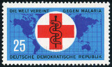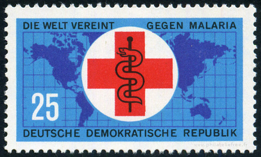 25p., bleu, violet, rouge et noir Y&T N°650 Michel N°943 Herausgegeben von 1963 Dentelé 12½ Filigrane "DDR" Eradication du paludisme |