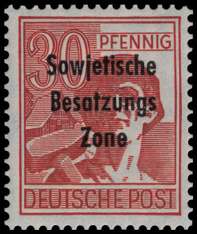 30p., rouge Y&T N°18 Michel N°192 Herausgegeben von 1948 Dentelé 14 Filigrane "POST DEUTSCH" Surcharge "Sowjetische Besatzungs Zone" |