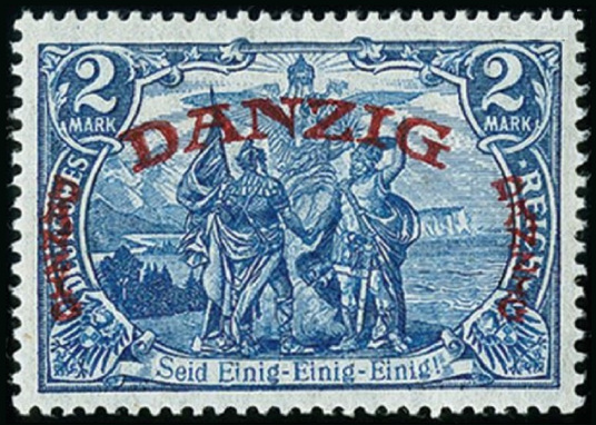 2m., bleu Y&T N°37 Michel N°49 Herausgegeben von 1920 Avec surcharge rouge Danzig en arc de cercle |