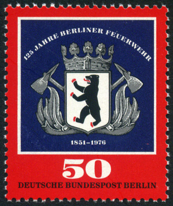 50p., rouge, bleu-noir, argent et noir Y&T N°487 Michel N°523 Emis en 1976 Dentelé 14 125e anniversaire des pompiers de Berlin |