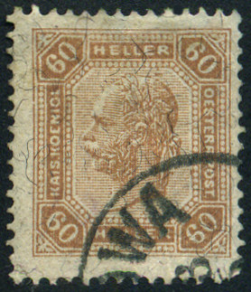 60h., brun-jaune Y&T N°76 Michel N°80A Emis en 1899 Valeur en Heller Papier avec fils de soie Chiffres inscrits en noirs Dentelé 12½x13, 13x13½ |