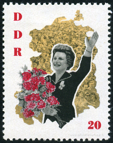 20p., ocre, noir et carmin Y&T N°692 Michel N°994 Emis en 1963 Dentelé 13½ Filigrane "DDR" Visite de la cosmonaute Valentina Terechkova |