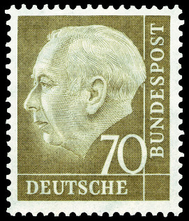 70p., olive Y&T N°71C Michel N°191 emitida el 1954 Dentelé 14 Filigrane "B P" Gravé 70e anniversaire du président Thedore Heuss |