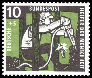 10p. + 5p., noir et vert Y&T N°143 Michel N°271 emitida el 1957 Dentelé 14 Filigrane "DBP" Hommage aux mineurs |
