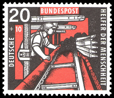 20p. + 10p., noir et rouge Y&T N°144 Michel N°272 emitida el 1957 Dentelé 14 Filigrane "DBP" Hommage aux mineurs |