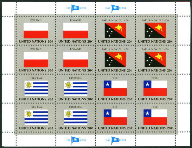 20c. x 16, polychrome et gris Y&T N°F420-423 Emis en 1984 Drapeaux des états membres de l'organisation des Nations Unies (série V) Papier avec fragments de fils de soie Dentelés 12 |