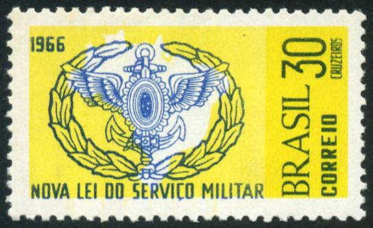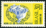 30cr., citron et bleu Y&T N°801 Scott N°BR 1114 Emis en 1966 Nouvelle loi sur le service militaire Filigrane "CORREIO ☆ BRASIL" Dentelé 11x11½ |