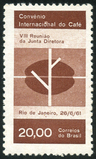 20cr., brun, brun foncé et brun clair Y&T N°708 Scott N°BR 1005 Issued on 1961 8e réunion de la Convention internationale du café, à Rio de Janeiro Filigrane "CORREIO ☆ BRASIL" Dentelé 11½x11 |