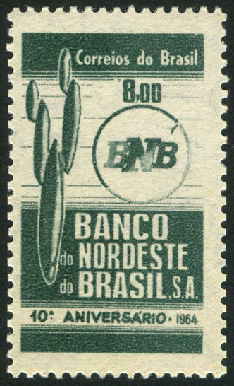 8cr., vert Y&T N°750 Scott N°BR 1051 Issued on 1964 10e anniversaire de la banque du Nord-Est Filigrane "CORREIO ☆ BRASIL" Dentelé 11½ |