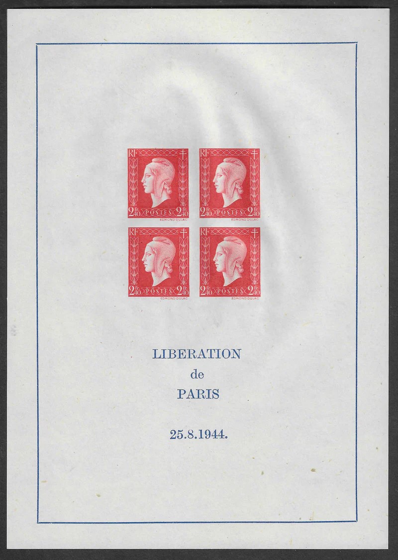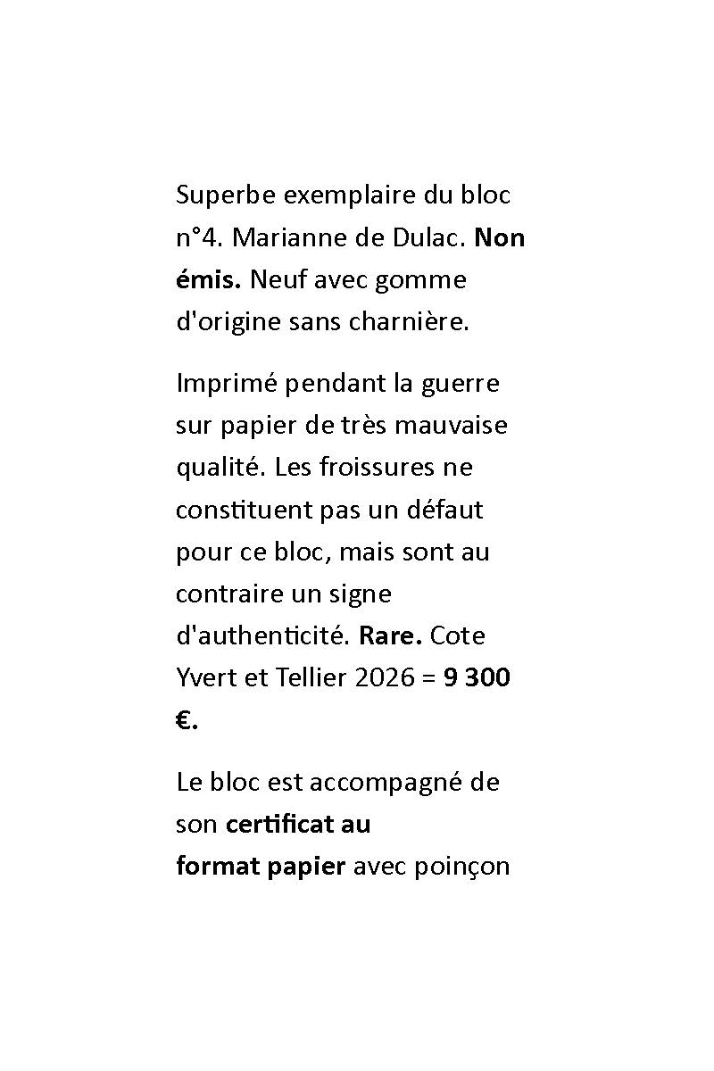 Superbe exemplaire du bloc n°4. Marianne de Dulac. Non émis. Neuf avec gomme d'origine sans charnière. Imprimé pendant la guerre sur papier de très mauvaise qualité, les froissures ne constituent pas un défaut pour ce bloc, mais sont au contraire un signe d'authenticité. Rare. Cote Yvert et Tellier 2026 = 9 300 ¤.