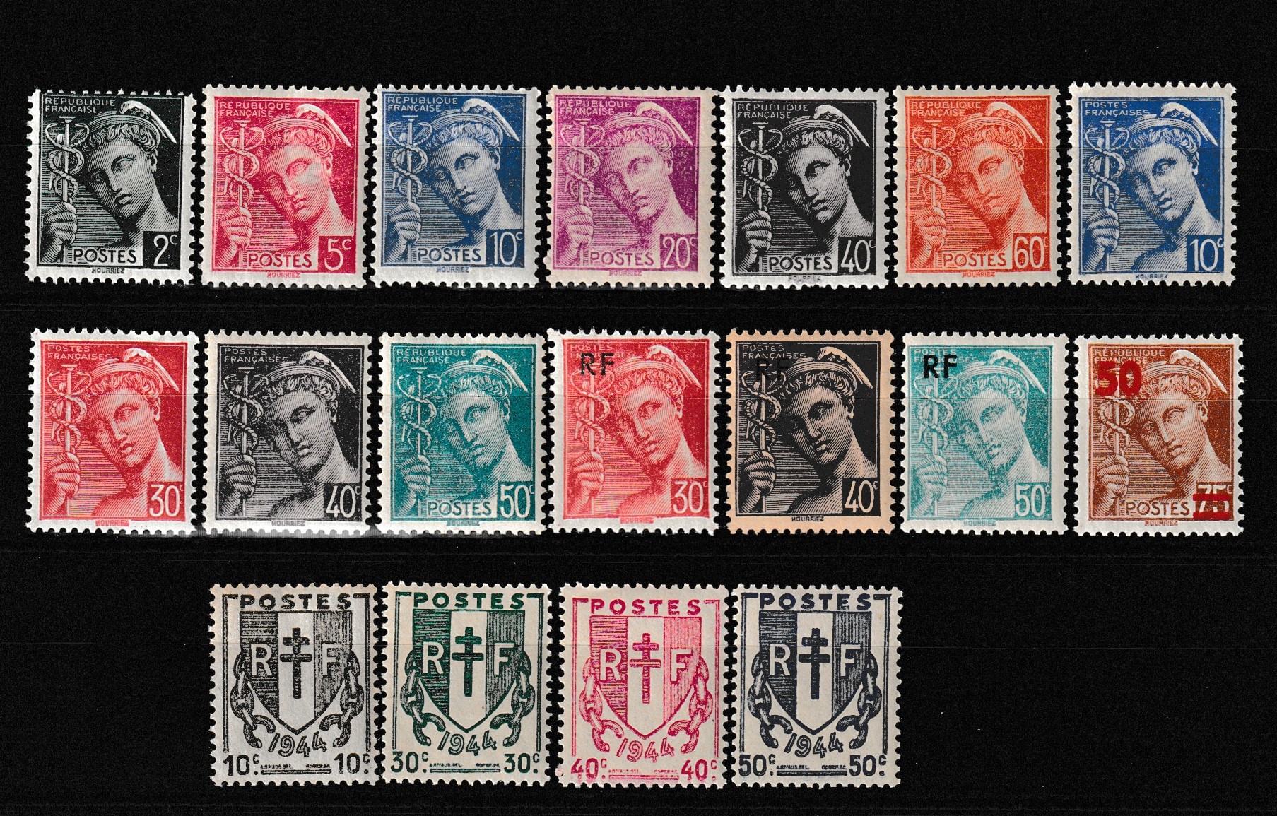 - 3 timbres type Mercure surchargés RF n° 658, 659, 660 (1944).