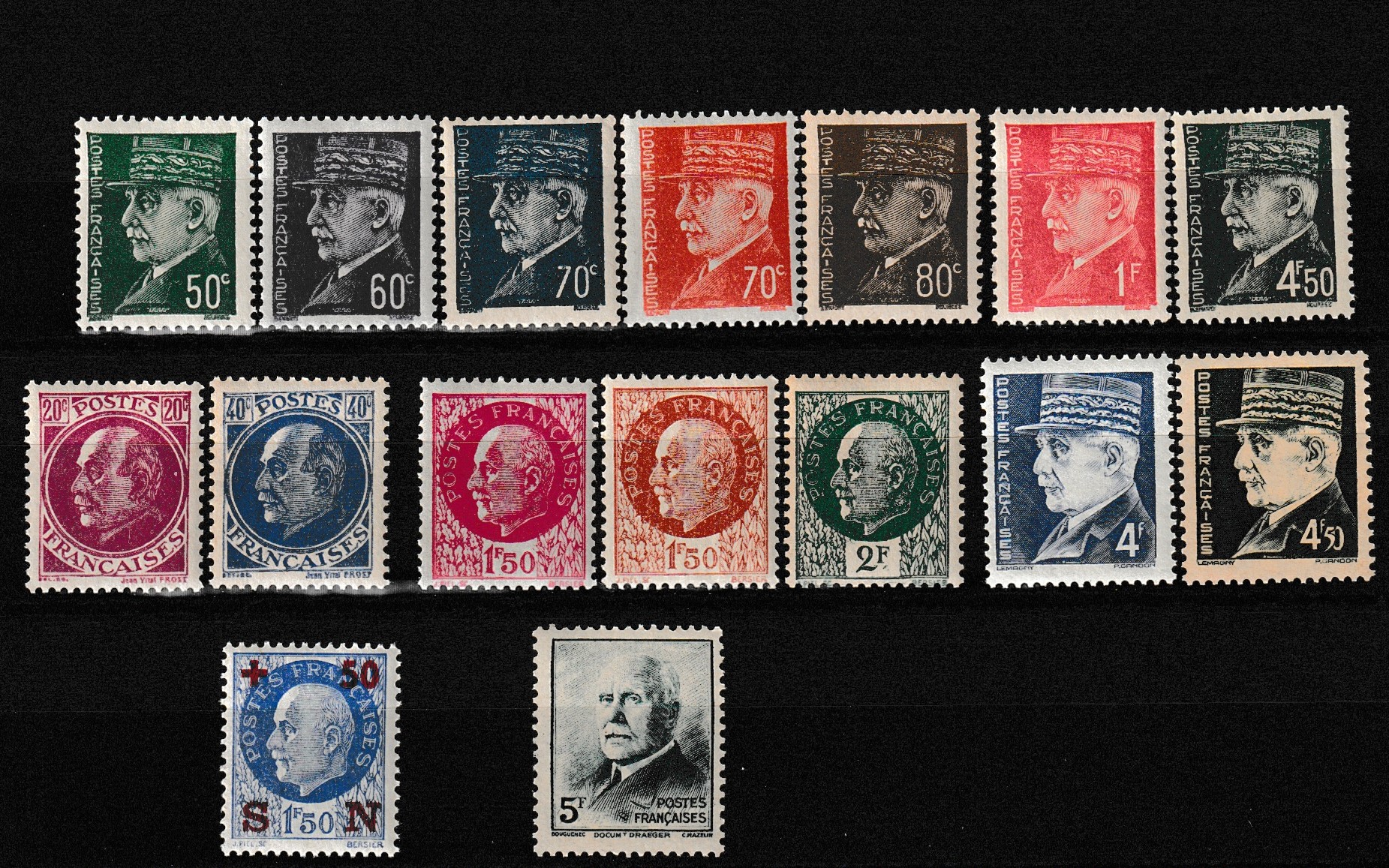 - 9 timbres effigie de Pétain type Hourriez n° 508, 509, 510, 511, 512, 514, 521B, 521A, 523 ((1941-42).