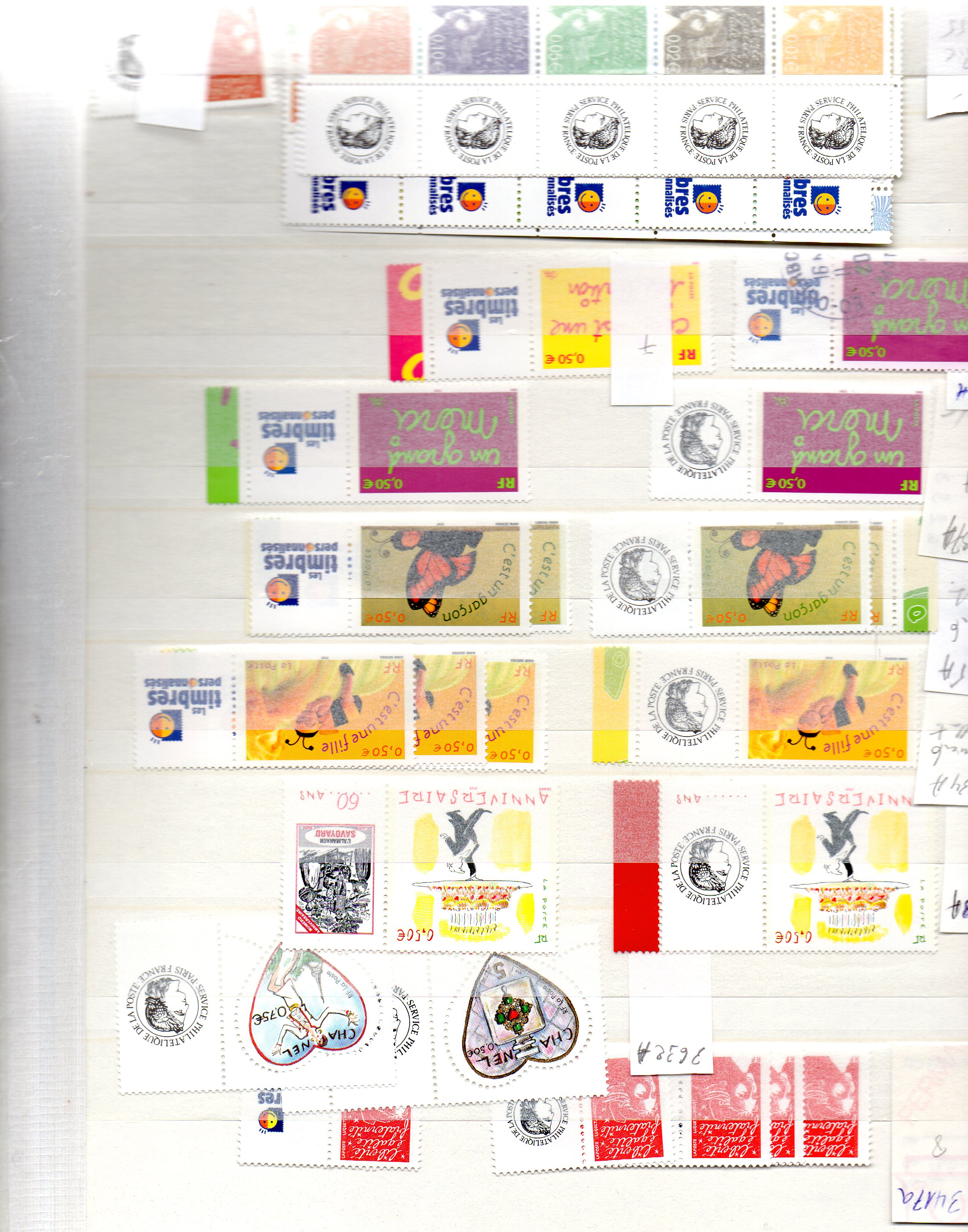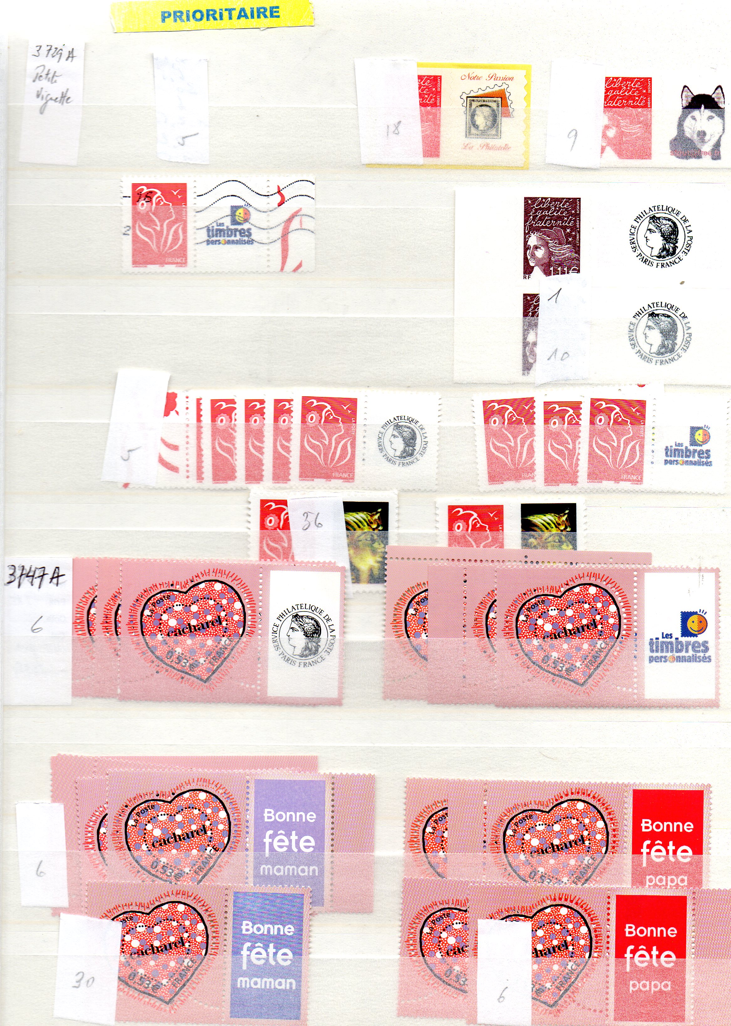 Mes collections : France neuf** ou neuf* de 1849 à ce jour. France adhésif Neuf** pour les pro et oblitéré pour les timbres de carnet. (oblitéré pratiquement complet) les manques 2874 type II (oblitéré)7a/3101c-16c (neuf et oblitéré) 3747- 50 (oblitéré)3748 51a s/poste oblitéré/89-3956 neuf**/91-3958neuf**/92-3959neuf**/103-oblitéré/.