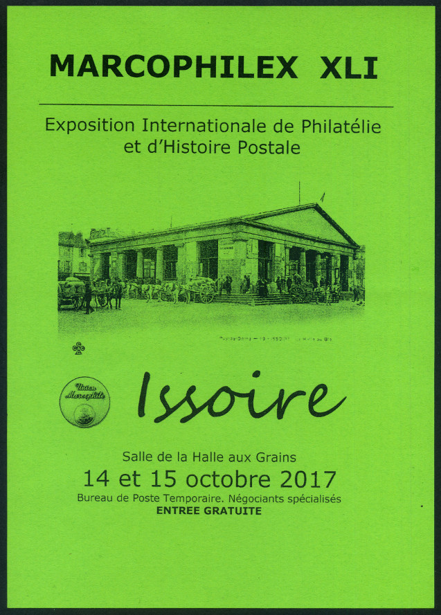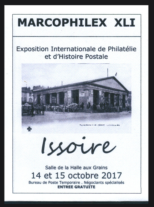 La 41e édition de l'exposition internationale d’histoire postale Marcophilex – Marcophilex XLI – se tiendra les samedi 14 et dimanche 15 octobre 2017 à Issoire dans le Puy-de-Dôme, dans la halle aux grains, en plein centre-ville. L’événement est co-organisé cette année avec le Club philatélique d’Issoire et Philapostel Auvergne, avec le soutien actif de la municipalité d’Issoire et de La Poste Auvergne.