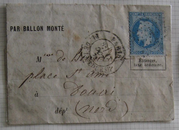 Vends un ballon monté : enveloppe ayant circulé sur le ballon Le Victor Hugo. Cachet de départ du 17 octobre 1870.